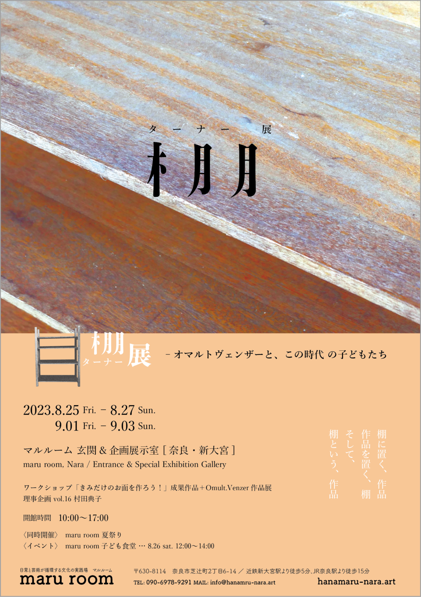 今回は、「ターナー(棚)」の第一回目としてワークショップ「きみだけのお面を作ろう!」 の成果作品を「ターナー(棚)」に展示します。オマルトヴェンザーも「ターナー(棚)」と皆さんのお面と一緒に、作品を発表します。どうぞお越しください。
